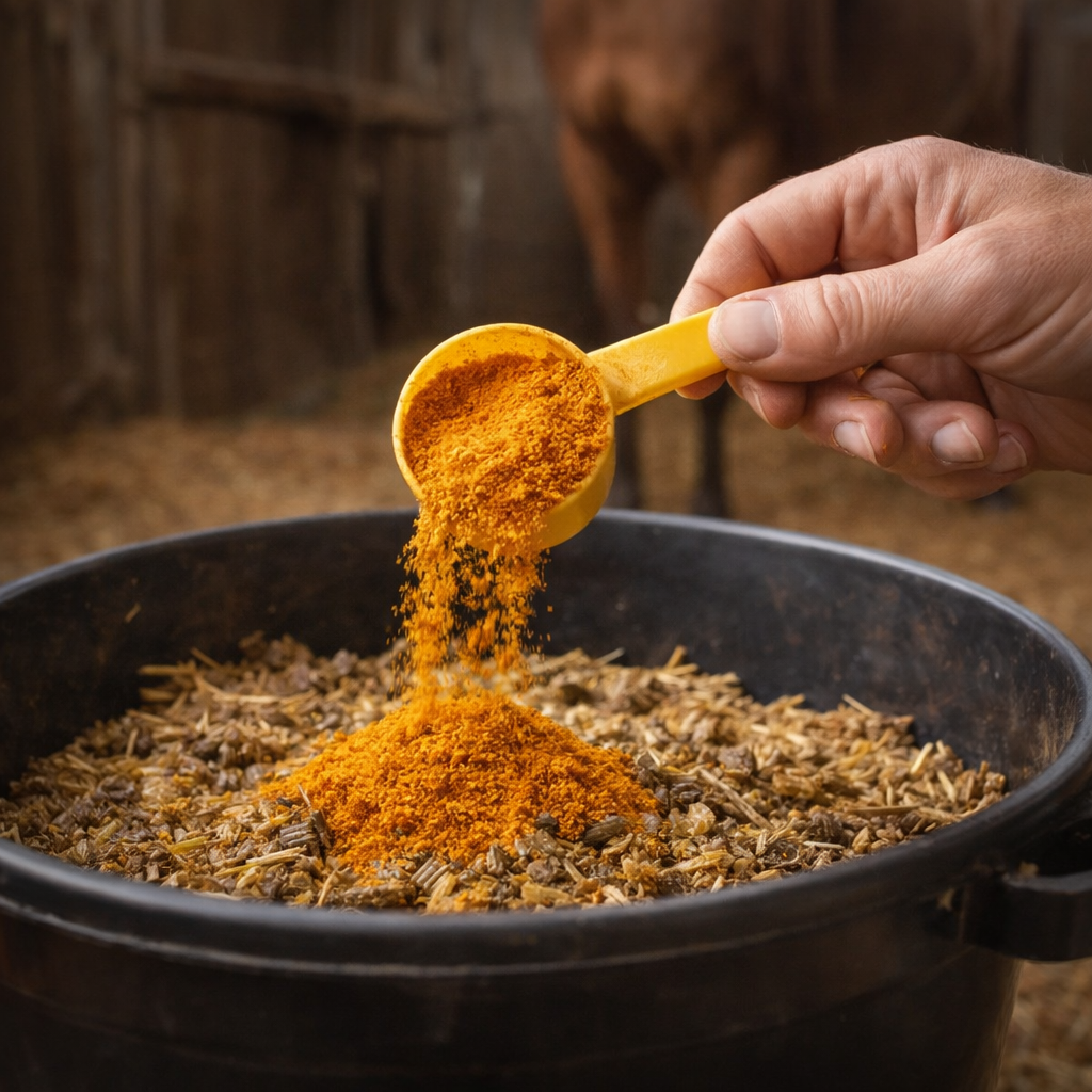 Just add TurmeriX to your horse's daily feed. The fine powder consistency mixes easily, and most horses take to it without fuss.